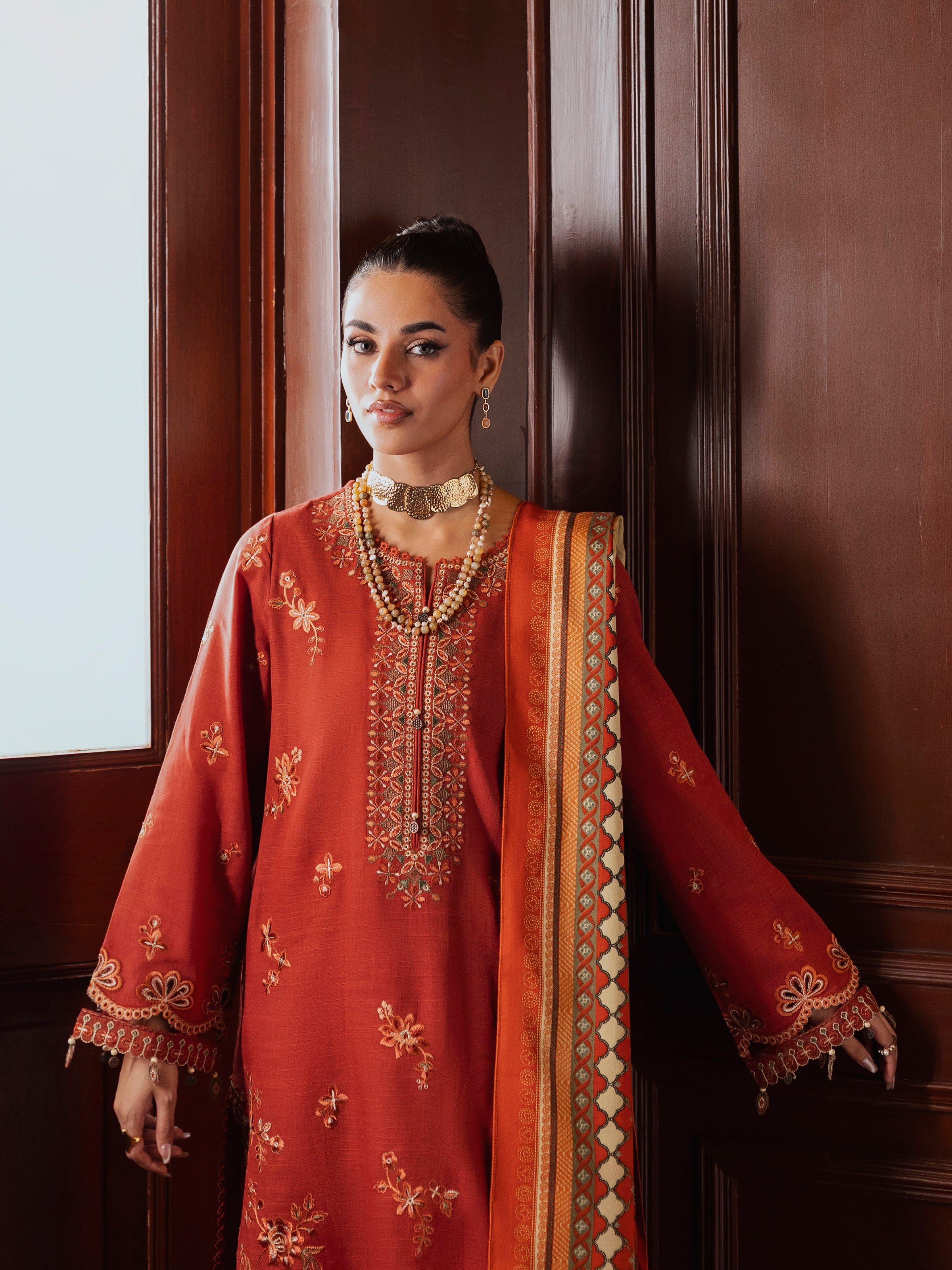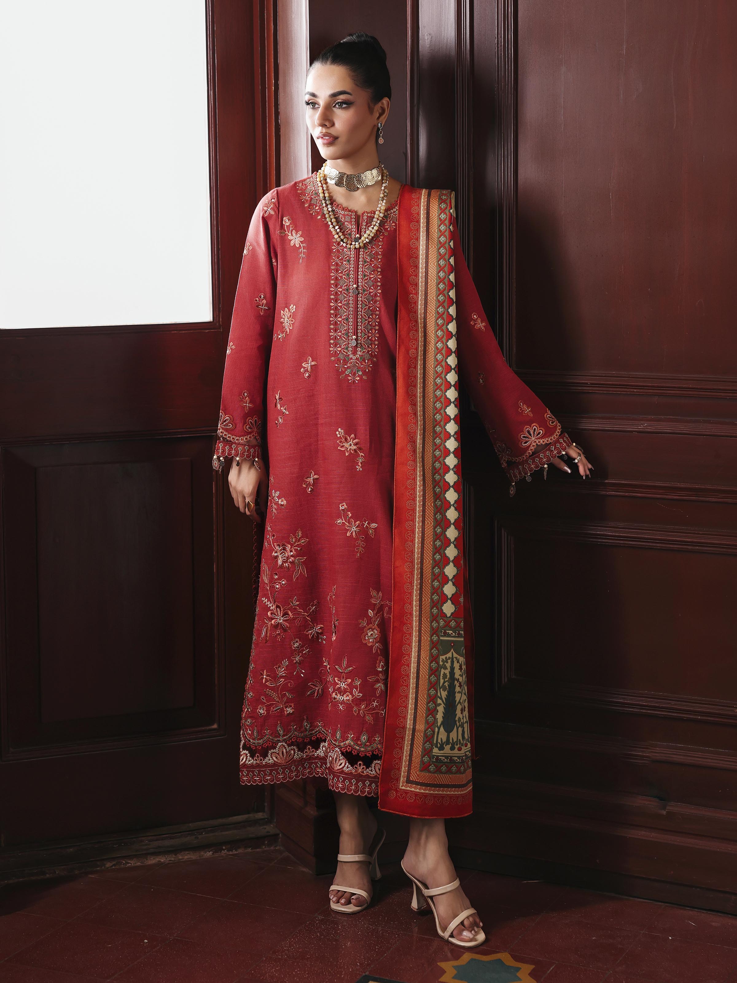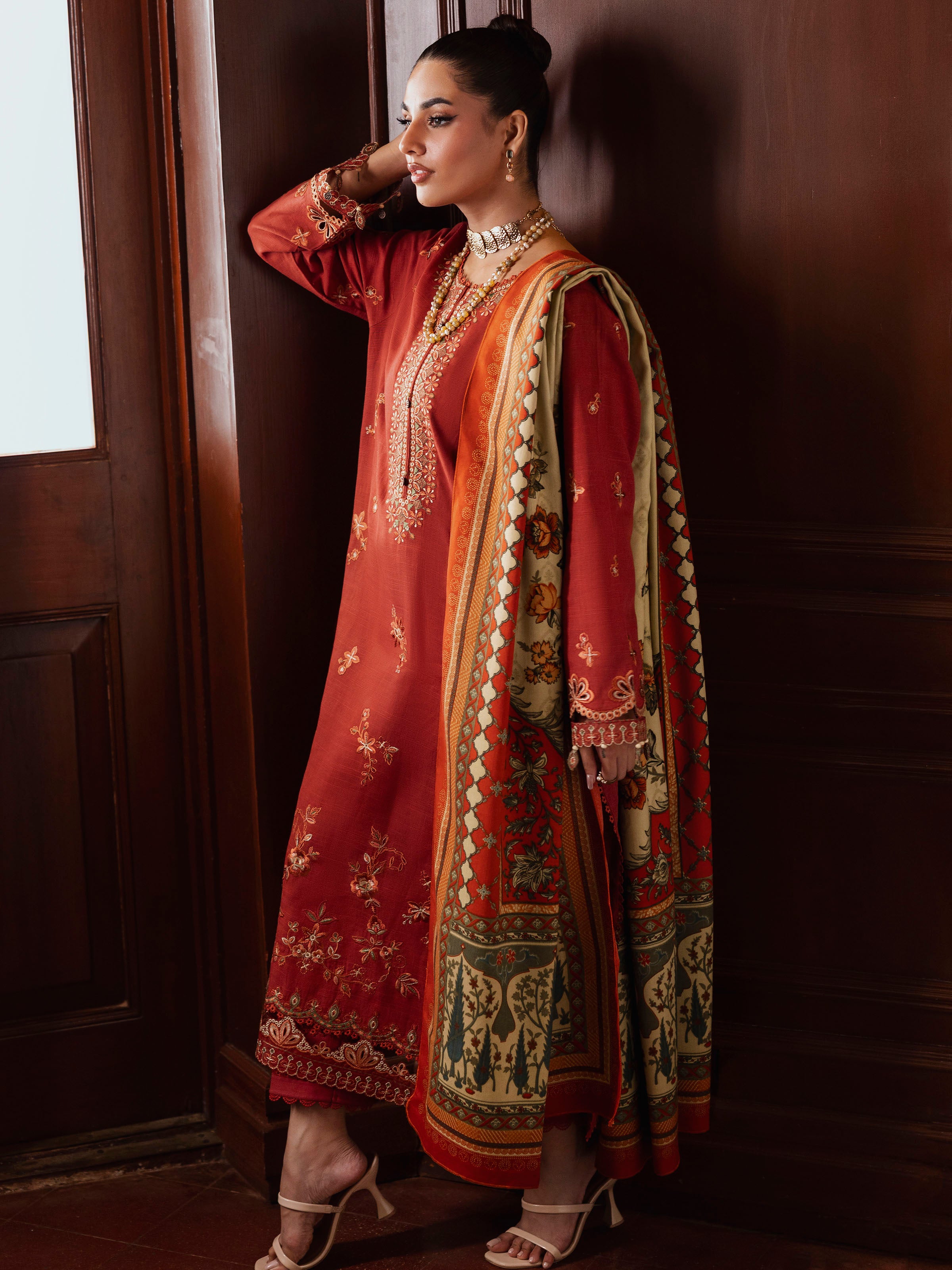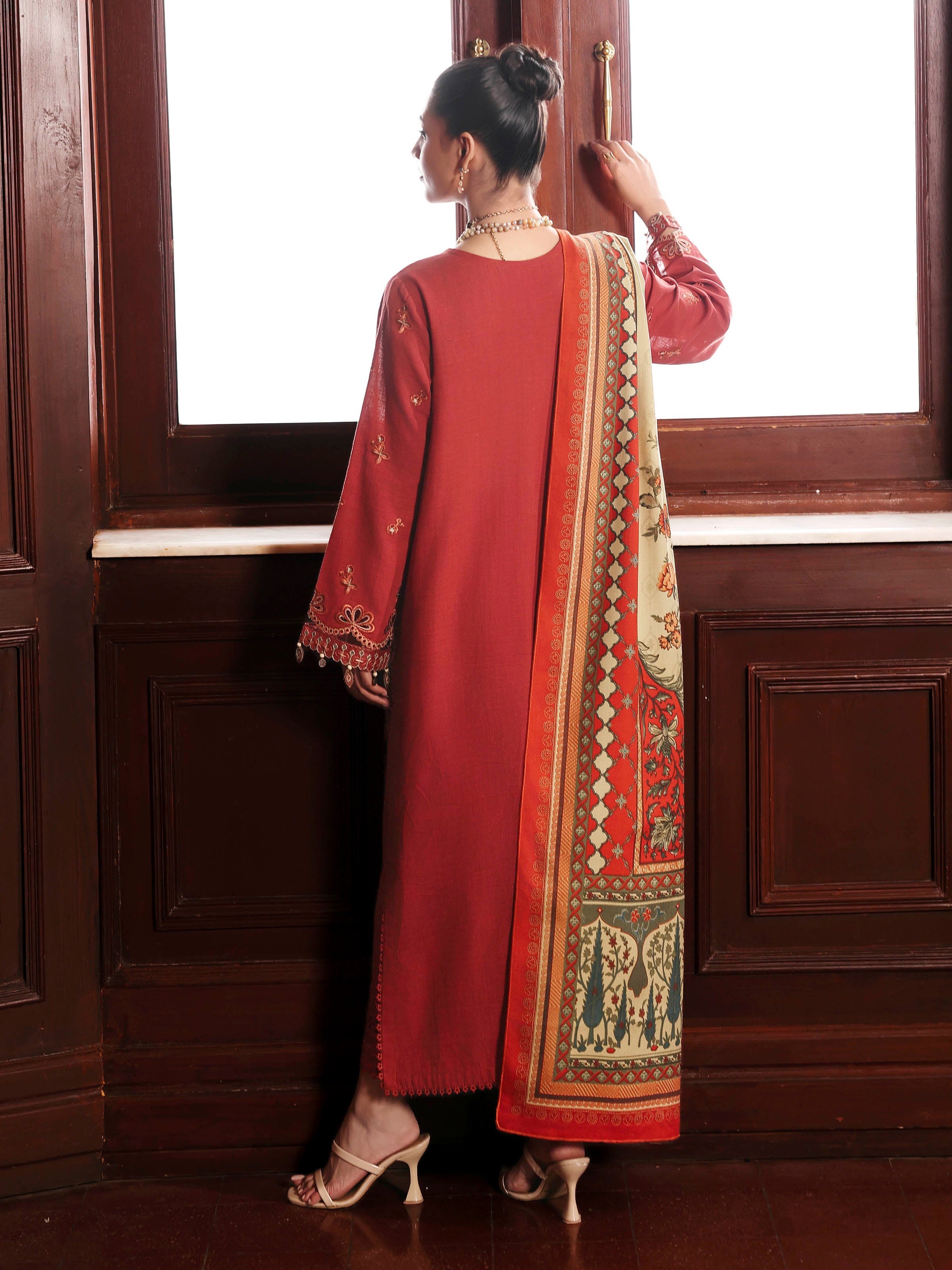 Unstitched Rust Embroidered Khaddar 3 Piece